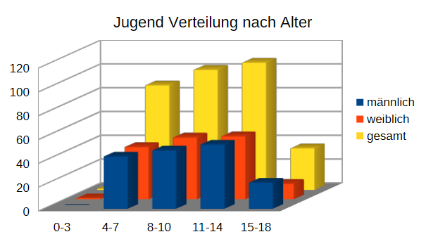 Ende Dezember 2023 hatte der Verein 565 Mitglieder, darunter 59% Jugendliche und 41% Erwachsene. Die Altersstruktur zeigen nachstehende Diagramme: